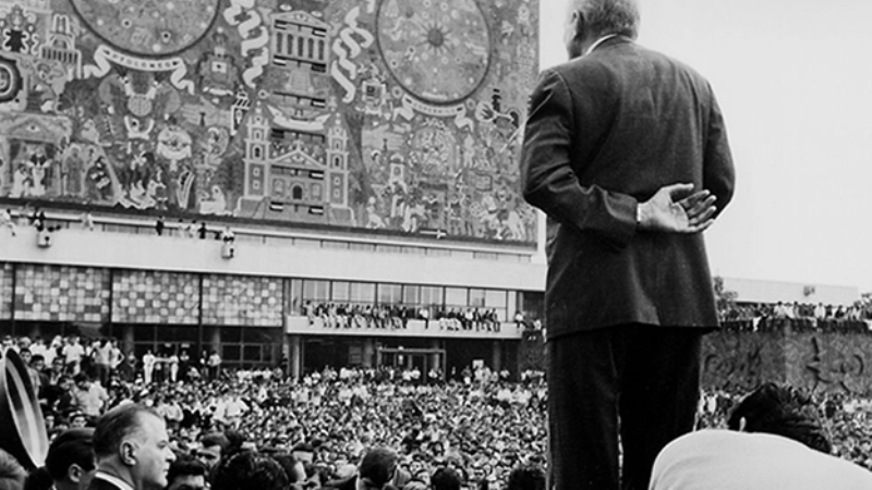 Tiempos de dignidad para las autoridades universitarias. Mitin de Javier Barros Sierra en reacción a la toma de San Ildefonso por el ejército.
