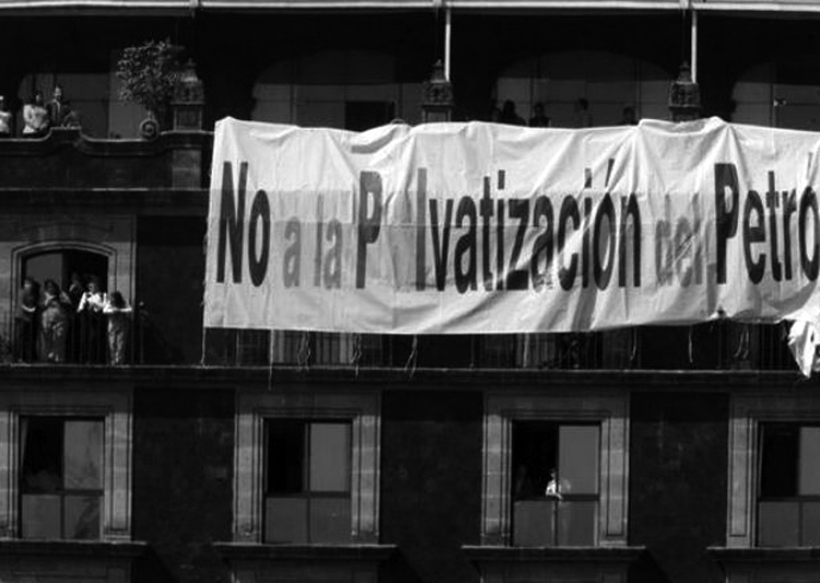 3. Sea como sea, lo más significativo ocurrió en la mañana. La entrega de condecoraciones y ascensos a elementos del ejército, fuerza aérea y armada de México, que iba a realizarse en el campo Marte, terminó celebrándose en el Zócalo… con un desfile militar que no pudo ser presenciado por casi nadie porque el ejército acordonó el perímetro de la plaza, pero que incluyó el despliegue de aviones —lo que ocasionó el cierre repentino del aeropuerto (durante dos horas)— y, sobre todo, una manta contra la llamada reforma energética que decía “No a la privatización del petróleo”. El video es elocuente:
