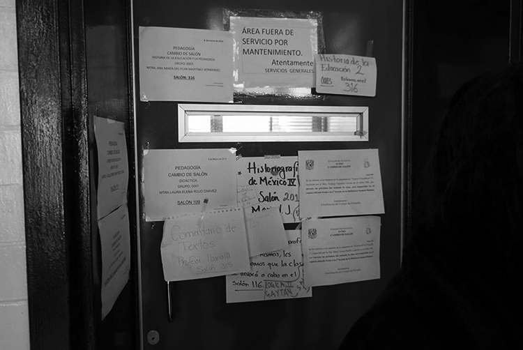 9 de marzo, 08:40 a. m. Un grupo camina por el pasillo principal del primer piso de la facultad, gira a la derecha, sube la escalera que conduce a “las coordinaciones”. No hay nadie… sí, una secretaria que va llegando; “toque en la puerta de vidrio, a ver si está el licenciado.” Y entonces, el contraste: una oficina abierta, un trabajador responsable. “¿Licenciado, qué hace usted aquí?”, le pregunta el profesor de “Comentario de textos”, “yo llego a las ocho y usted ya llegó, a veces me voy a las nueve de la noche y usted sigue aquí”. “Estamos en una oficina de servicio; estamos para dar servicio”, se limitó a responder el licenciado. Mientras buscaba un salón disponible escuchaba la narración de los hechos y asentía resignado: “Hemos reportado ese salón muchas veces, dicen que lo van a arreglar y no hacen nada… está éste, pero es para 30 alumnos… no; espere; el 315 es para 40. Vaya al 315.”