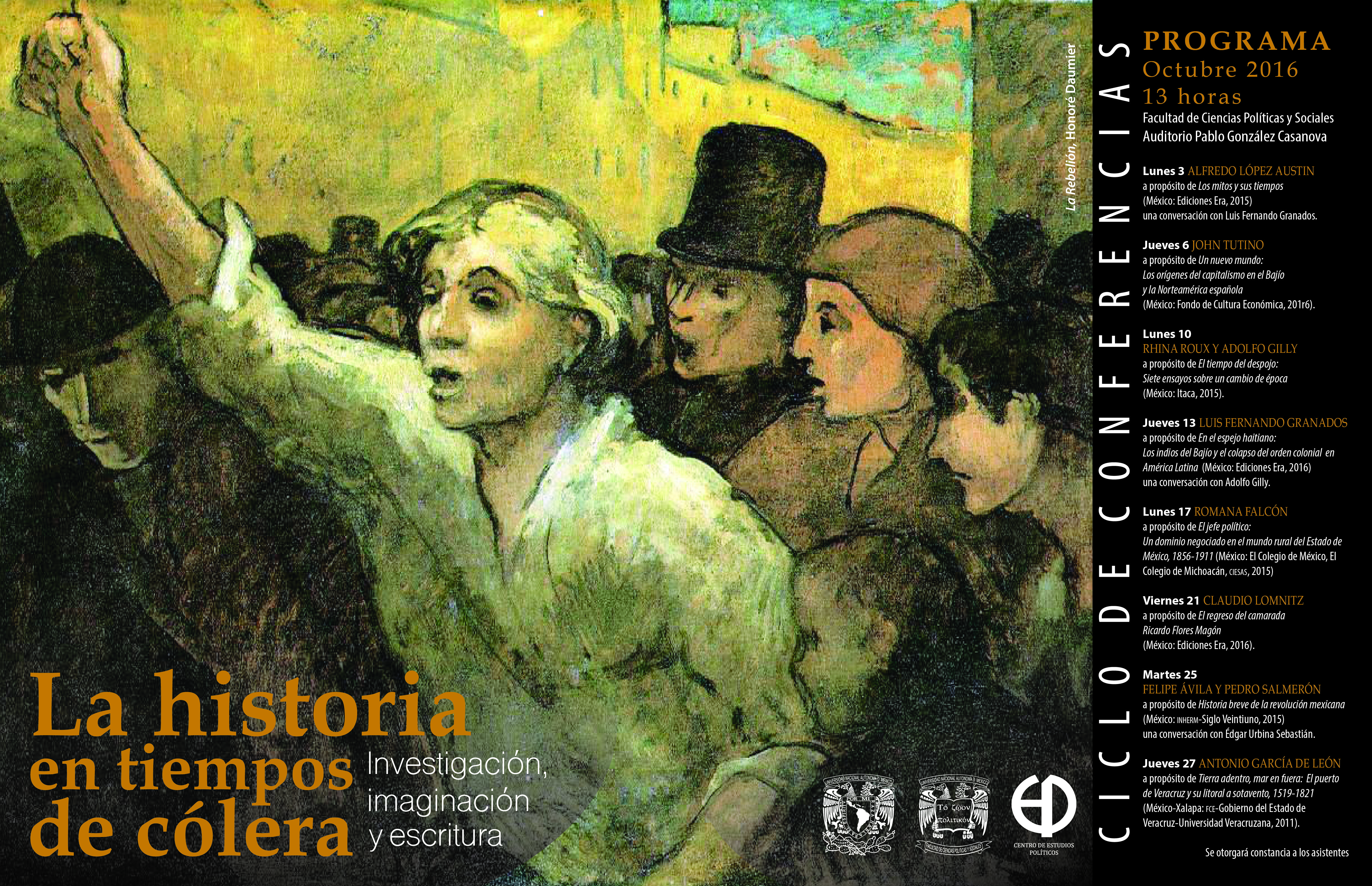 Entre el 3 y el 27 de octubre, 2016, en la Facultad de Ciencias Políticas y Sociales de la UNAM se celebró el ciclo de conferencias La historia en tiempos de cólera: Investigación, imaginación y escritura, organizado por Adolfo Gilly, Édgar Urbina Sacristán y Luis Fernando Granados. Dada la altísima calidad de casi todas sesiones, nos ha parecido pertinente compartilas aqui.
