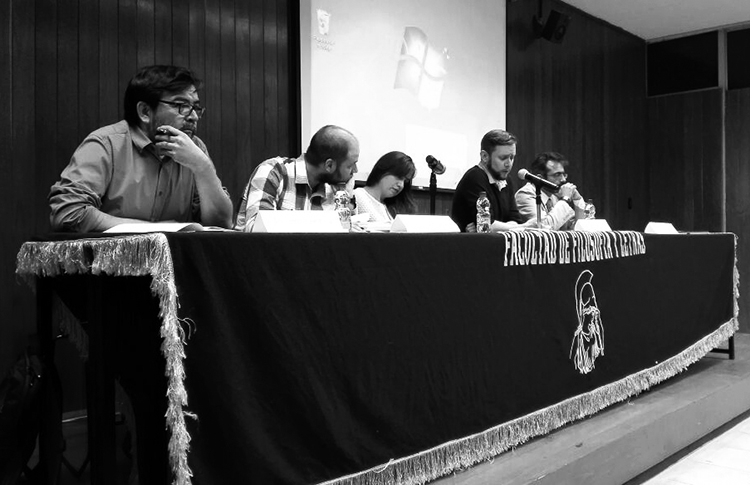 Luis Fernando Granados, Javier Yankelevich, Halina Gutiérrez Mariscal, Héctor Vera y Bernardo Ibarrola en la Facultad de Filosofía y Letras de la UNAM, (Foto: Dalia Argüello.)