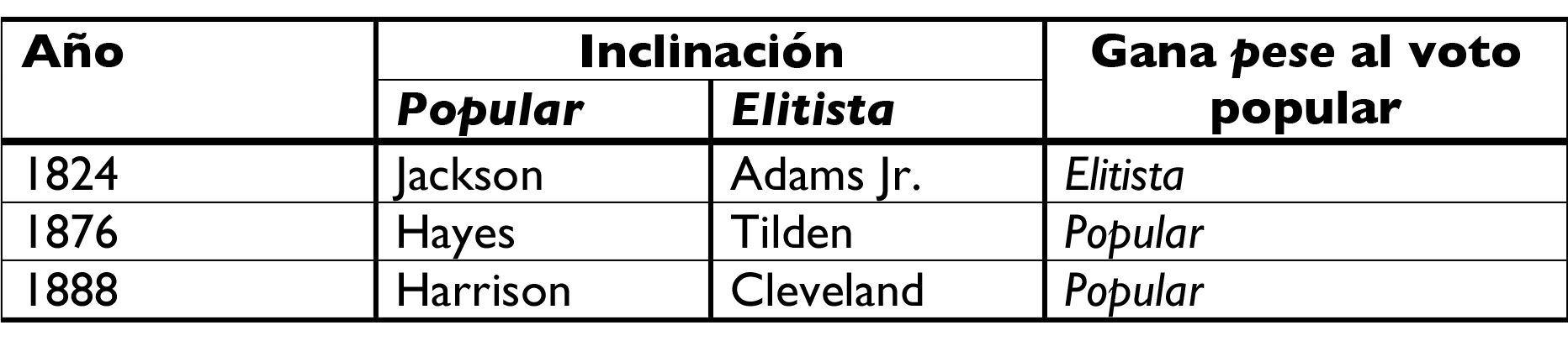 He resumido los casos históricos de no coincidencia entre el voto popular y el voto en colegio electoral para ver si este mecanismo resultó efectivamente un freno frente a la mob rule, como lo deseaban Madison y Hamilton en 1787. Como tres de los casos ocurren en el siglo XIX y dos en nuestra era, la comparación puede parecer difícil. De entrada, los calificativos modernos de izquierda y derecha podrían entorpecer el cotejo de los casos. El caso de 1824 es ilustrativo. ¿Puede calificarse a Andrew Jackson y a la Jacksonian Democracy (1828-1854) como de izquierda? Siendo esclavistas, nunca. Pero cuando se les confronta con el elitismo del régimen previo (1788-1828), los jacksonianos definitivamente parecen “populares”. Por lo mismo, acaso el mejor modelo para comparar sería entre populares y elitistas —dicotomía que, aparte, puede ayudar a entender la elección de 2016.